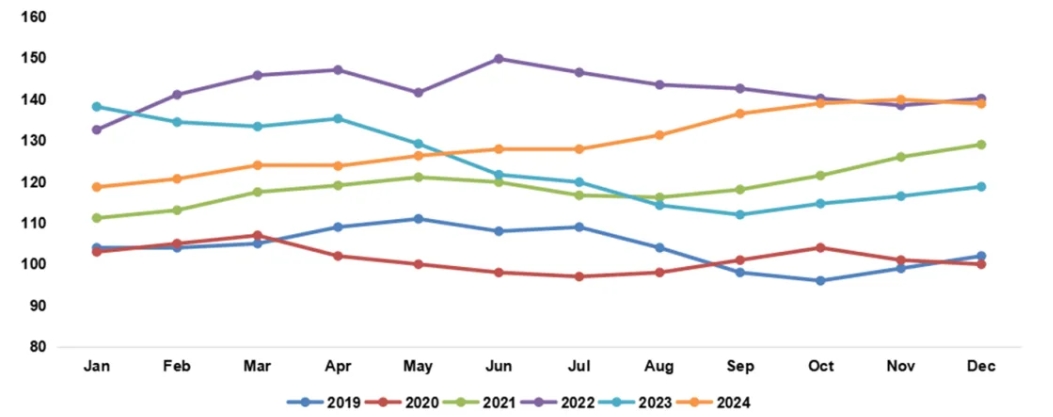 2024年全球乳制品價(jià)格指數(shù)較2023年小幅上漲,2024年平均價(jià)格指數(shù)為129.6,較2023年的124.0增長(zhǎng)4.5%,月度價(jià)格指數(shù)在下半年高于2023年同期。價(jià)格指數(shù)上漲的主要原因是黃油價(jià)格的大幅上漲。