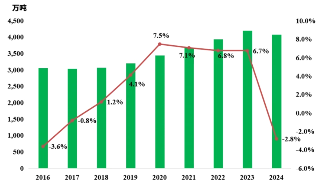 牛奶產(chǎn)量:中國(guó)牛奶產(chǎn)量自2018年起連續(xù)四年增長(zhǎng),2023年達(dá)4,197萬(wàn)噸,同比增長(zhǎng)6.7%。2024年產(chǎn)量同比下降2.8%,降至4,079萬(wàn)噸,為2018年以來(lái)首次負(fù)增長(zhǎng),標(biāo)志著中國(guó)牛奶產(chǎn)量增長(zhǎng)進(jìn)入新的調(diào)整階段。