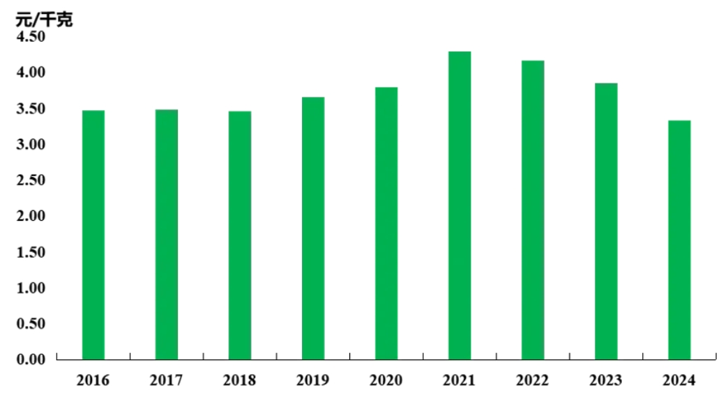 牛奶價(jià)格:自2022年起,國(guó)內(nèi)奶源出現(xiàn)階段性過(guò)剩,生鮮乳價(jià)格持續(xù)下行,截至2024年12月,已連續(xù)24個(gè)月環(huán)比下降,并創(chuàng)下2013年以來(lái)的新低點(diǎn)。2024年,中國(guó)生鮮乳(原料奶)均價(jià)持續(xù)走低,年平均價(jià)格為3.33元/千克,較2023年減少0.52元/千克,同比下降13.43%。