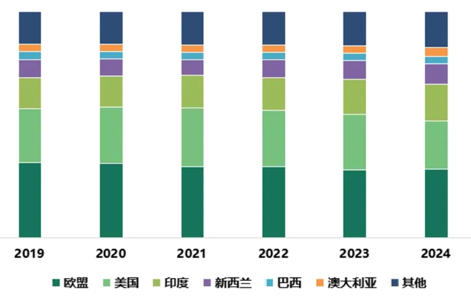 2024年,全球脫脂奶粉總產(chǎn)量471萬(wàn)噸,較2023年減少37萬(wàn)噸,降幅0.8%,TOP5國(guó)家占全球總量的80%。其中,歐盟產(chǎn)量143萬(wàn)噸,同比減少0.4%;美國(guó)產(chǎn)量102萬(wàn)噸,同比減少13.0%;印度產(chǎn)量76萬(wàn)噸,同比增長(zhǎng)3.4%;新西蘭產(chǎn)量43萬(wàn)噸,同比增長(zhǎng)9.0;巴西產(chǎn)量16萬(wàn)噸,與2023年基本持平;澳大利亞產(chǎn)量18萬(wàn)噸,同比增長(zhǎng)20.7%。