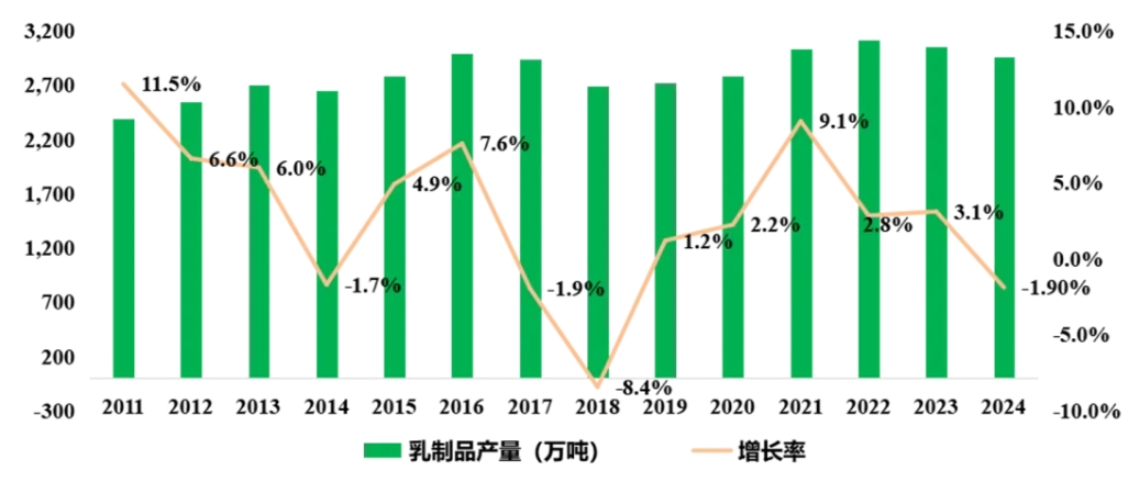 根據(jù)國(guó)家統(tǒng)計(jì)局?jǐn)?shù)據(jù), 2024年中國(guó)規(guī)模以上乳品企業(yè)乳制品產(chǎn)量為2,962萬(wàn)噸,同比下降1.9%。主要是中國(guó)市場(chǎng)供需失衡、消費(fèi)疲軟、成本壓力、行業(yè)調(diào)整以及國(guó)際市場(chǎng)競(jìng)爭(zhēng)共同作用,導(dǎo)致2024年中國(guó)乳制品產(chǎn)量下降。