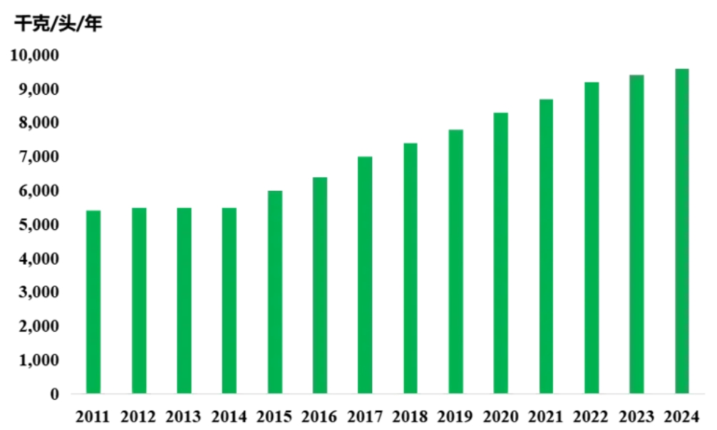 受低產(chǎn)奶牛淘汰、奶牛養(yǎng)殖技術(shù)及牛場(chǎng)管理水平提升等因素影響,奶牛單產(chǎn)穩(wěn)步提高,2023年達(dá)9,400千克/頭/年,2024年單產(chǎn)達(dá)到9,600千克/頭/年,漲幅2%左右。