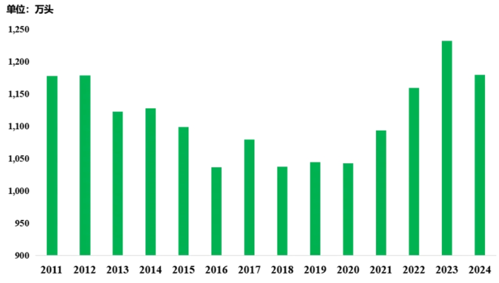 2011-2018年,受環(huán)保整治、奶牛養(yǎng)殖效益差等因素影響,中國(guó)奶牛存欄呈下降趨勢(shì)。2018年下半年起奶價(jià)走高,奶牛養(yǎng)殖效益向好,奶牛存欄持續(xù)回升,2023年中國(guó)奶牛存量為1233萬(wàn)頭,比2018年增加約200萬(wàn)頭,2024年由于奶價(jià)持續(xù)下跌,養(yǎng)殖虧損面擴(kuò)大,部分牧場(chǎng)淘汰低產(chǎn)奶牛,奶牛存欄下降4%左右。