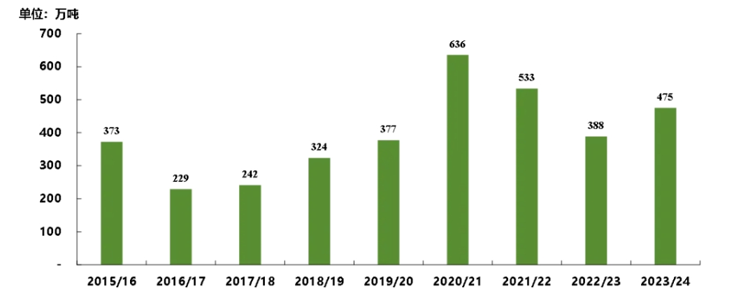 圖,2015/16—2023/24榨季中國食糖進口量變化