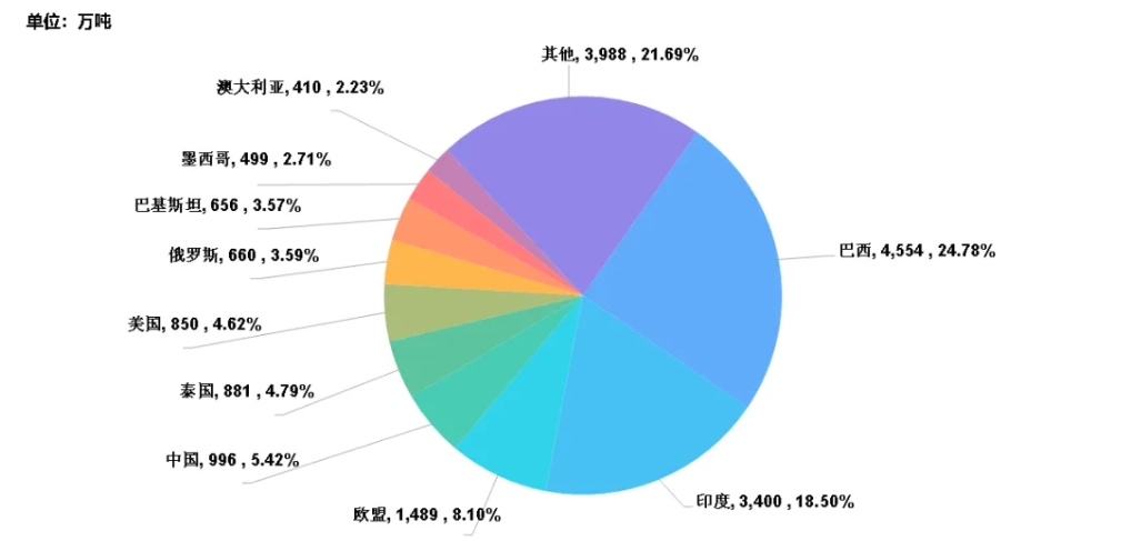 圖,2023/24榨季全球主要產(chǎn)糖國(地區(qū))食糖產(chǎn)量及占比