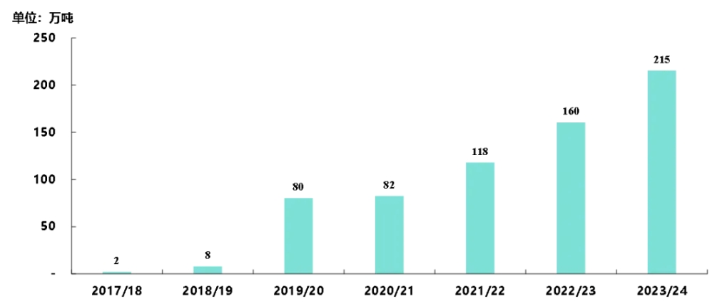 圖,2017/18-2023/24中國糖漿和預混粉進口量變化