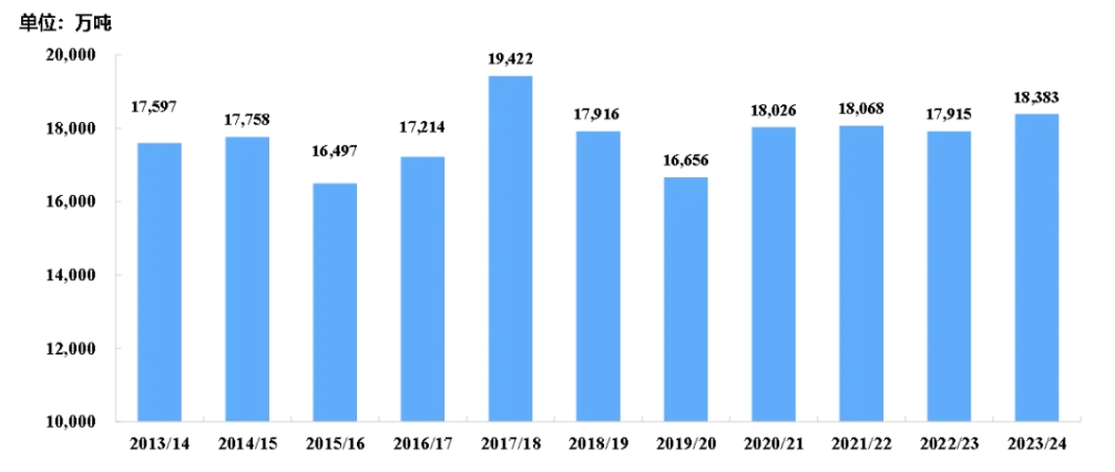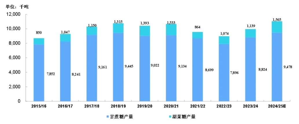 圖,2015/16-2024/25榨季中國食糖產(chǎn)量