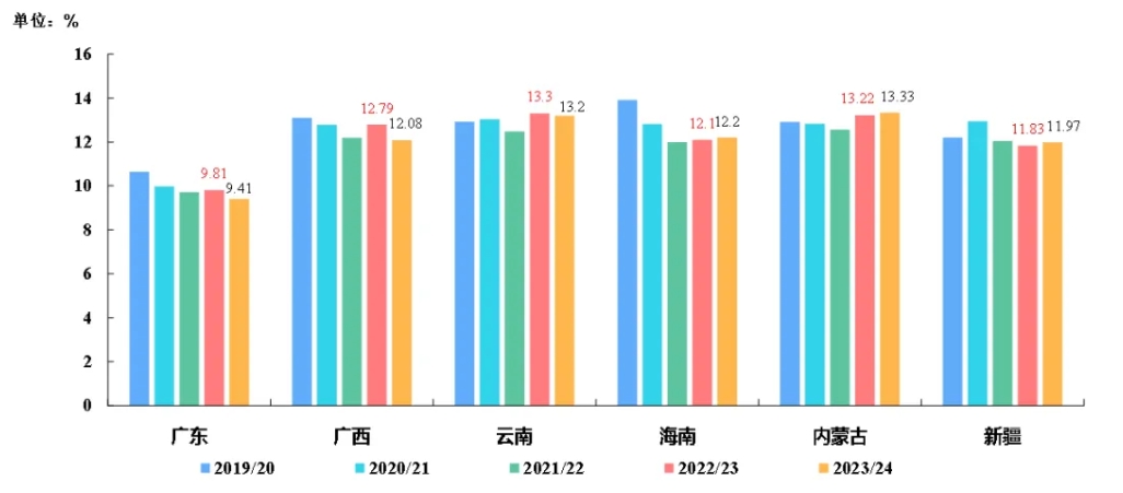 圖,2019/20—2023/24榨季中國主要食糖產(chǎn)區(qū)出糖率變化