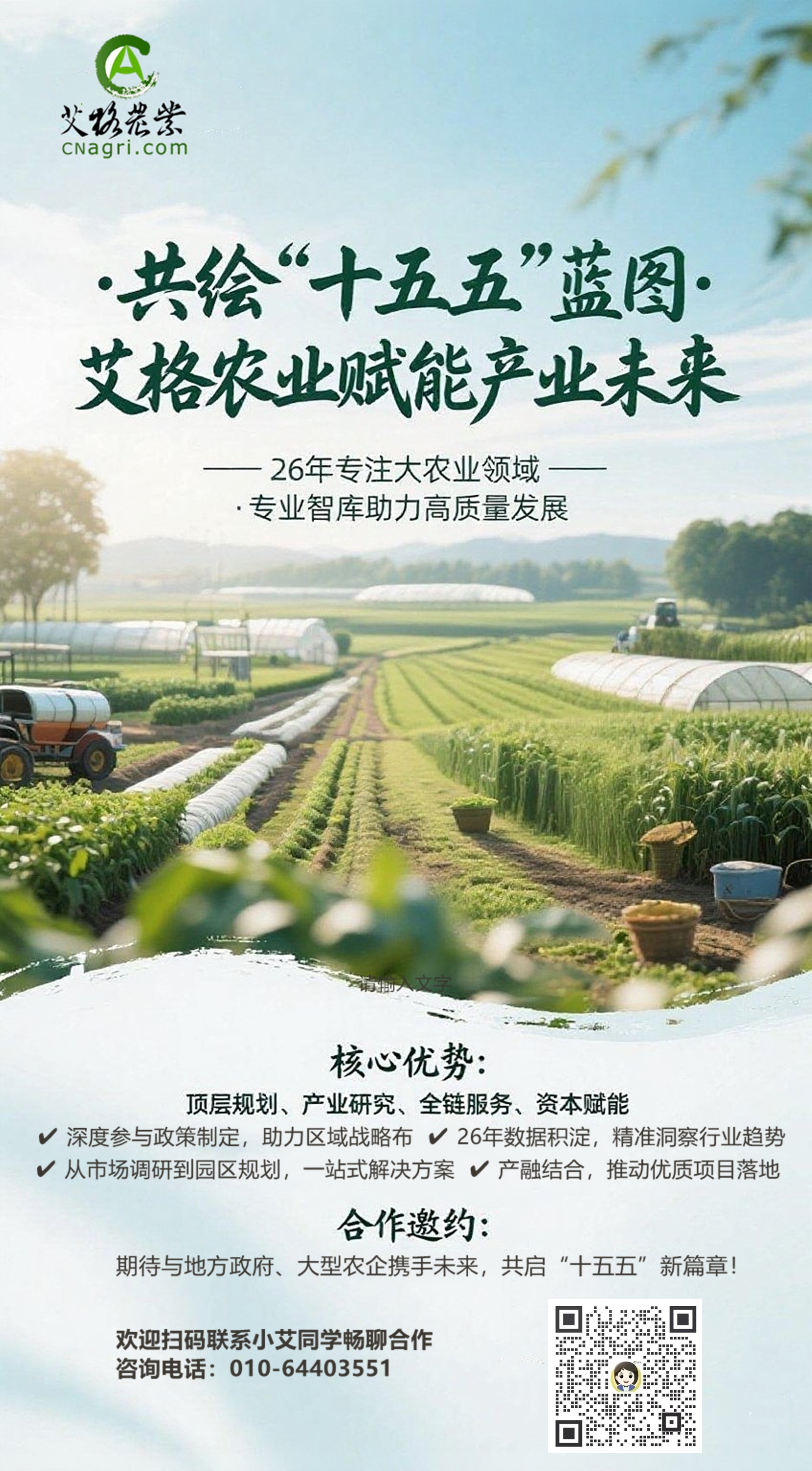 當(dāng)前,各地正在緊鑼密鼓地制定“十五五”規(guī)劃,艾格農(nóng)業(yè)作為專注于大農(nóng)業(yè)泛食品領(lǐng)域的領(lǐng)先研究咨詢和投資機(jī)構(gòu),憑借26年的深厚數(shù)據(jù)積累和專業(yè)經(jīng)驗(yàn),為政府、企業(yè)及各類機(jī)構(gòu)提供包括頂層規(guī)劃、產(chǎn)業(yè)研究、市場(chǎng)調(diào)研、戰(zhàn)略咨詢、園區(qū)規(guī)劃以及投融資服務(wù),期待與更多伙伴攜手,共繪“十五五”藍(lán)圖。