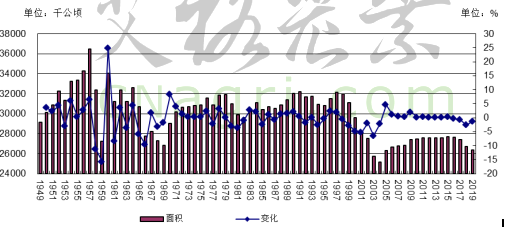 小麥播種面積22984千公頃,比2018年減少418.7千公頃,下降1.8%。
