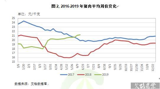 (1)2019年6月14日中國36個大中城市白條豬主要批發(fā)市場平均價格21.68元/千克,環(huán)比上漲3.29%。豬肉市場批發(fā)價為21.21元/千克,環(huán)比上漲0.57%。