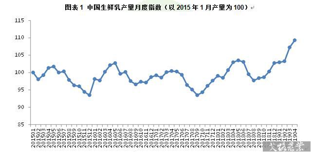 按指數(shù)推算,2019年前4個月,生鮮乳產量同比增加5.4%。根據(jù)官方監(jiān)測數(shù)據(jù)及業(yè)內人士訪談,中國奶牛存欄量仍在下滑,生鮮乳產量增長主要來自單產提升。分析認為,隨著高溫天氣出現(xiàn),熱應激影響下生鮮乳產量指數(shù)可能結束上漲態(tài)勢。