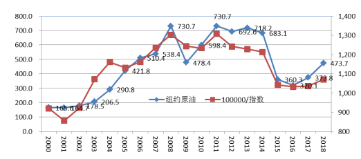 石油價格和礦產(chǎn)品價格上漲 2018年國際原油年度均價503.7美元/噸,較上年上漲29.9%,為4年來的最高水平,世界原油連續(xù)2年上漲,累計漲幅為54.9%,但是較2013年的歷史高位下降33.4%。