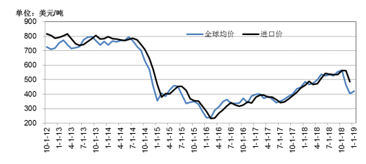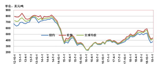 國際油價持續(xù)大幅下滑對市場產(chǎn)生的明顯的沖擊,最后導致中國聯(lián)合石油公司的大量浮虧,聯(lián)合石油問題爆雷后,中國央行的干預帶來全球油價重新反彈。2019年1月全球石油價格為422美元/噸,環(huán)比上漲4.63%,同比下滑13.19%。