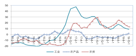 圖1.11中國工農(nóng)產(chǎn)品月度價格走勢及價格剪刀差,2016.8-2018.10