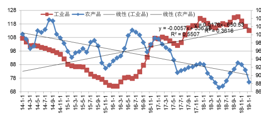 圖1.3 中國工農(nóng)產(chǎn)品價格剪刀差對比,2014-2019