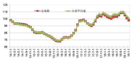 2019年1月大宗商品的總體綜合價格指數(shù)為106,環(huán)比下降2.8%,同比下降6.2%;分類價格指數(shù)為109,環(huán)比下降2.5%,同比下降5.6%;分類商品環(huán)比化工、煤炭、農(nóng)產(chǎn)品和農(nóng)資下降最為明顯,分別下降5.05%、3.36%、3.26%和3.23%。