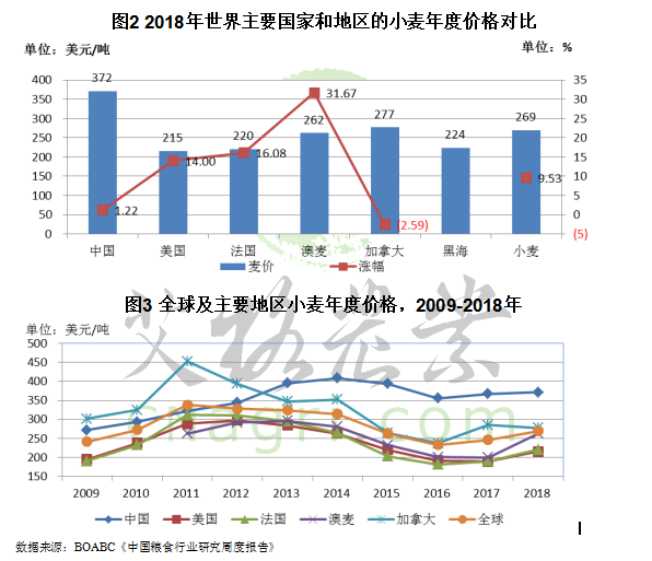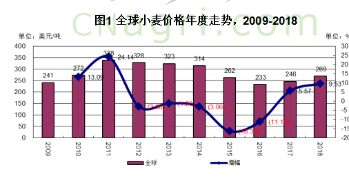2018年全球小麥繼續(xù)上漲,達(dá)到269美元/噸,漲幅為9.53%;2018年全球小麥價(jià)格較2009年以來歷史最低水平恢復(fù)上漲15.63%;較2011年最高水平低20.25%, 2018年世界小麥價(jià)格屬于恢復(fù)性上漲。