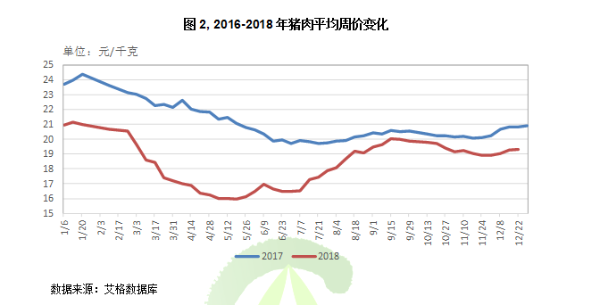 (1)2018年12月21日中國36個大中城市白條豬主要批發(fā)市場平均價格為18.02元/千克,環(huán)比下降0.17%。豬肉市場批發(fā)價為19.31元/千克,環(huán)比上漲0.31%。