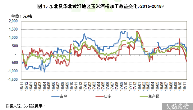 進(jìn)入11月份以來,玉米酒精企業(yè)加工效益呈直線下降趨勢(shì),到11月中旬主產(chǎn)區(qū)玉米酒精平均加工效益已跌至盈虧平衡點(diǎn)以下。其中,華北黃淮地區(qū)企業(yè)平均虧損近400元/噸,東北地區(qū)企業(yè)加工效益也降至200元/噸左右,均比11月初下降約400元/噸。這是由于,