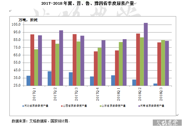 產(chǎn)量逐步下滑至12月的85.8萬噸,采暖季結(jié)束后又再次恢復(fù)至100萬噸附近水平。根據(jù)最新的統(tǒng)計數(shù)據(jù),2018年9月上述四省月度尿素產(chǎn)量合計在92.1萬噸,在錯峰生產(chǎn)的影響下,預(yù)計尿素的月度產(chǎn)量將低于去年同期水平。