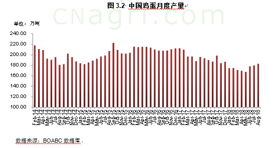 約為182萬(wàn)噸,環(huán)比增加1.31%,同比減少3.78%。預(yù)計(jì)2018年9月在產(chǎn)蛋雞存欄增加,雞蛋