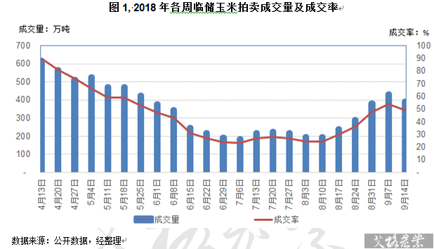 玉米大規(guī)模上市也僅有不到一個(gè)月的時(shí)間。不過,自8月份開始臨儲(chǔ)玉米拍賣成交量和成交率逐周提高,9月7日當(dāng)周臨儲(chǔ)玉米拍賣成交約430萬噸,9月14日當(dāng)周成交量仍高達(dá)393萬噸。BOABC認(rèn)為,這是由于: