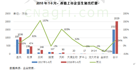 市場份額較去年同期4.6%,提升了1.5個百分點(diǎn)。其中,牧原、正邦和天邦保持較高幅度的增長,增幅分別為61%、157%和103%。