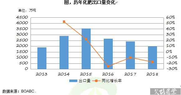 2018年前6個月,我國化肥出口量達956.8萬噸,同比降幅達15.2%,預計2018年化肥出口降到2000萬噸左右,2018年的化肥出口形勢也不容樂觀。政策利好減弱將直接導致化肥出口下降。