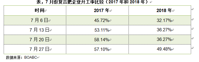 預(yù)收不到位不僅影響企業(yè)的資金周轉(zhuǎn),還影響企業(yè)原料采購以及后期的銷售,所以導(dǎo)致開工率下降。每年7月是主要企業(yè)北方秋季小麥肥生產(chǎn)旺季,但今年企業(yè)生產(chǎn)多有推后,裝置開工率回升相對較為緩慢,平均開工率僅50%,比去年同期減少近10%。