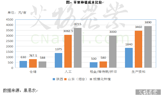 根據(jù)主產(chǎn)區(qū)投入來(lái)講,西北地區(qū)投入低于山東地區(qū),陜西畝均投入4345元,山東畝均投入7890元,規(guī)模化種植畝均投入11193元,成本相對(duì)較高。按照目前畝產(chǎn)3000-4000斤/畝計(jì)算,種植成本分別為陜西1.1-1.5元/斤,山東1.97-2.63元/斤,規(guī)?;度氤杀驹?.8-3.7元/斤。按照3元/斤幾個(gè)計(jì)算,每畝毛收入約10000元,扣除投入,凈收入約為2000-3000元/畝,按照目前典型的農(nóng)戶種植每戶5畝計(jì)算,一戶收入約為10000—15000元,這里并未包含人工成本,蘋(píng)果種植源頭已經(jīng)難以吸引大量年輕勞動(dòng)力投身。