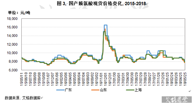 首先,供應(yīng)壓力較大。近兩年我國賴氨酸企業(yè)新建及擴(kuò)產(chǎn)步伐的加快,估計(jì)2018年產(chǎn)能將達(dá)到320萬噸左右,比上年約增加100萬噸,在全球占比超過65%。自三季度開始,新增產(chǎn)能陸續(xù)投放,供應(yīng)壓力進(jìn)一步加大。