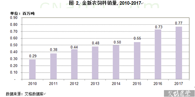 生豬飼料的生產(chǎn)企業(yè),在全國擁有100多家子公司,年飼料產(chǎn)能超2000萬噸,2017年雙胞胎飼料銷量達(dá)到900萬噸。金新農(nóng)的主要業(yè)務(wù)包括飼料業(yè)務(wù)、